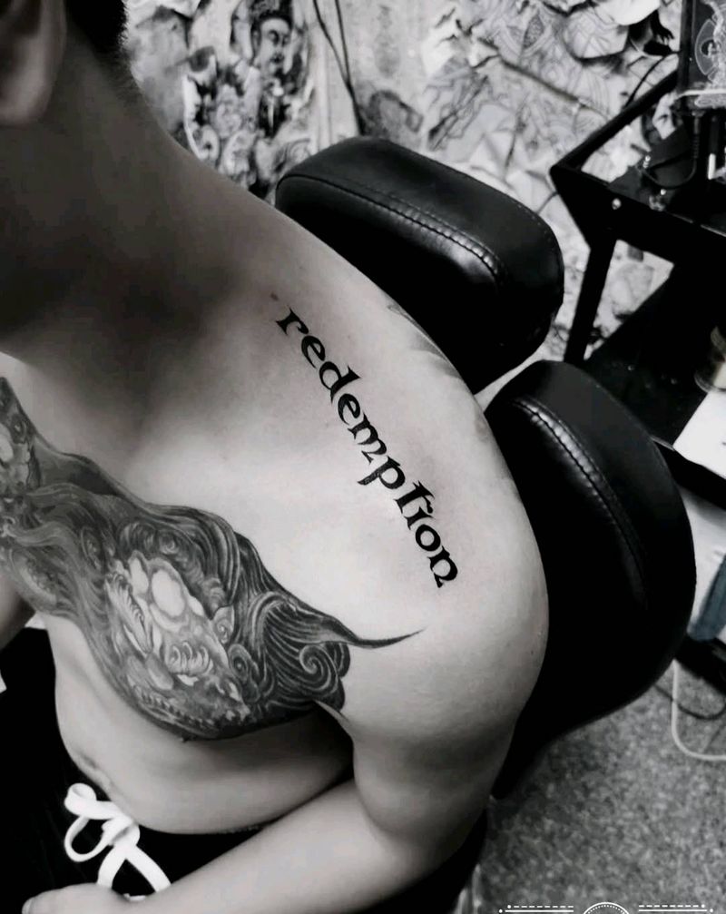 字母意思(救赎)纹身图片_肩部花体字纹身图案