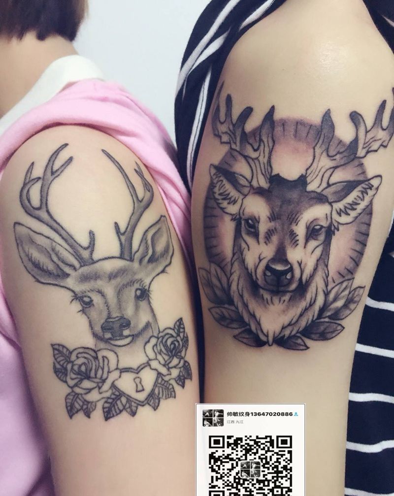 当前位置: 首页 >江西省九江市纹身店-帅敏纹身工作室纹身图案>情侣鹿纹身图片_成品手臂清新写实动物静物情侣纹身图案