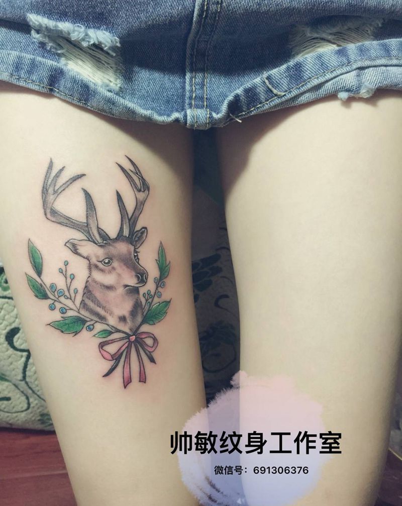 鹿卍纹身图片_帅敏TATTOO动物清新腿部插画纹身图案