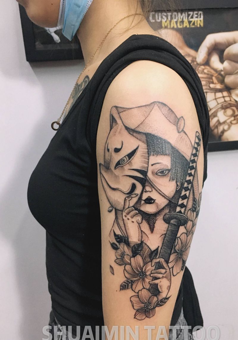 当前位置: 首页 >江西省九江市纹身店-帅敏纹身工作室纹身图案>艺妓纹身图片_肩部手臂点刺水墨纹身图案