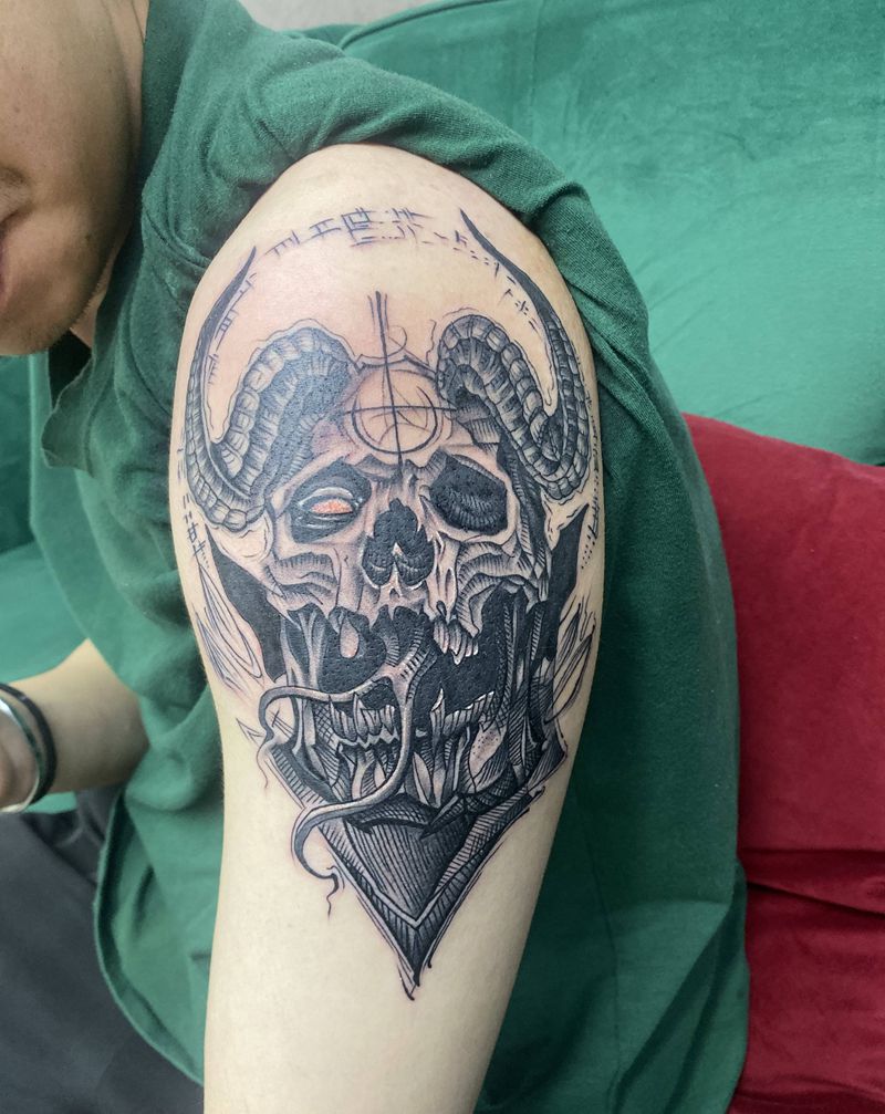当前位置: 首页 >江西省赣州市纹身店-赣州阿保纹身纹身图案>暗黑骷髅纹身图片_手臂欧美写实纹身图案