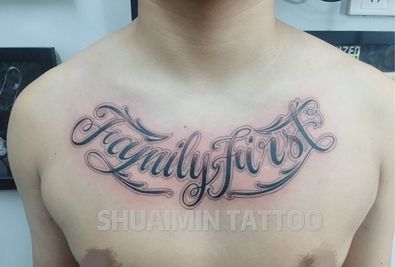 当前位置: 首页 >江西省九江市纹身店-帅敏纹身工作室纹身图案>奇卡诺字体纹身图片_胸部背部花体字New School纹身图案