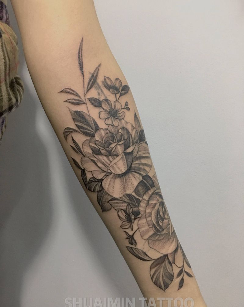 素花纹身图片_背部手臂点刺欧美写实纹身图案