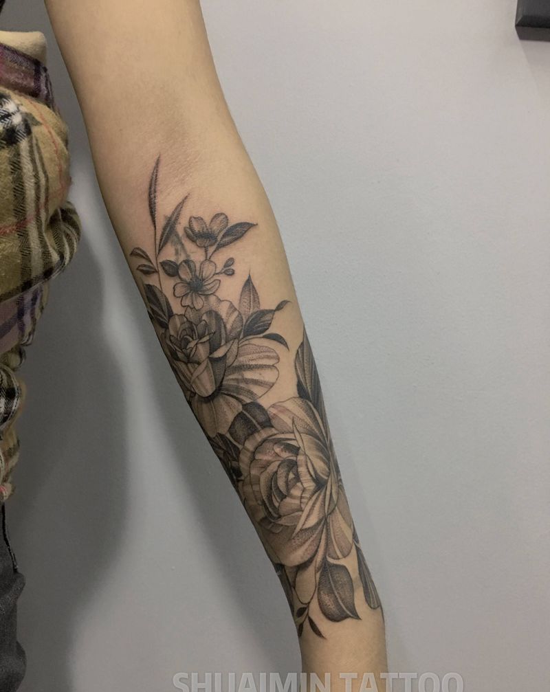 素花纹身图片_背部手臂点刺欧美写实纹身图案