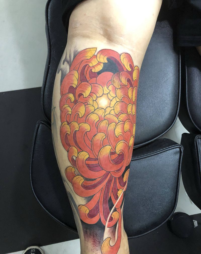 腿部菊花纹身图片_腿部新传统纹身图案