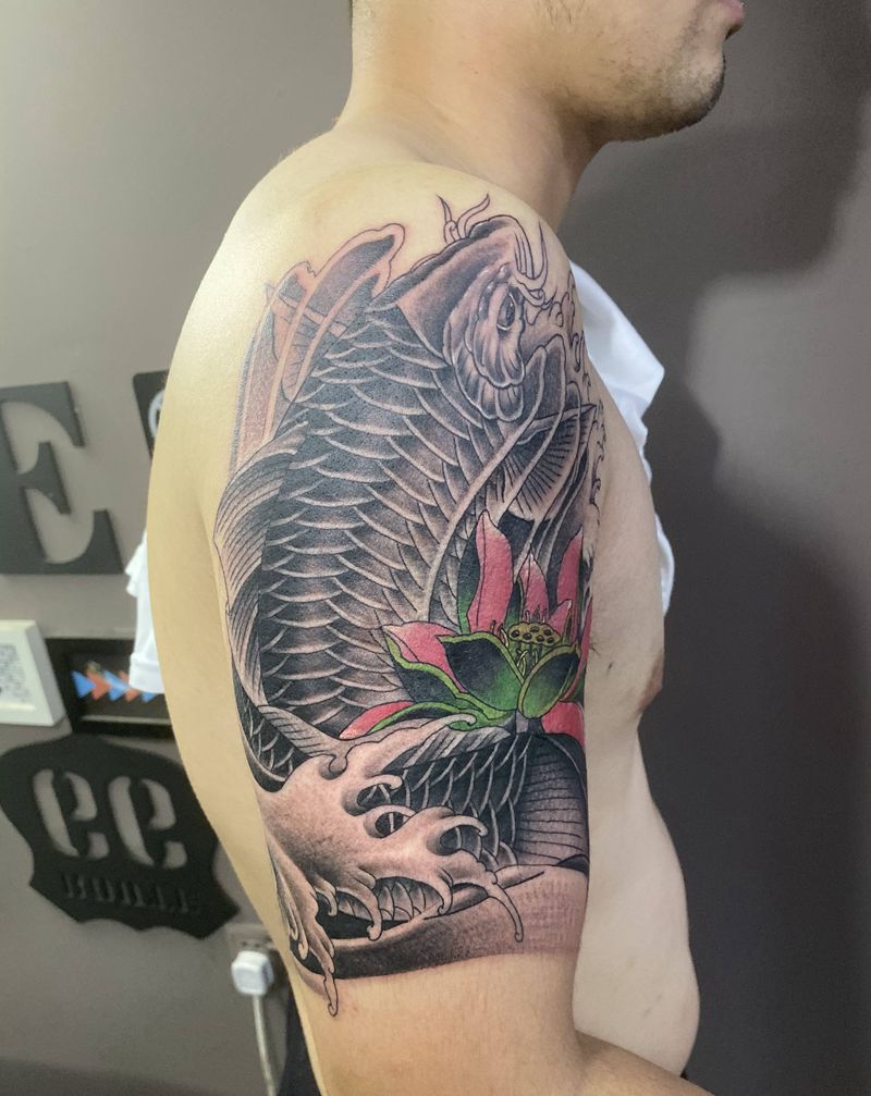 大臂鲤鱼纹身图片_背部手臂新传统纹身图案