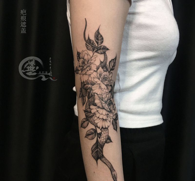 疤痕遮盖纹身图片_手臂素花纹身图案