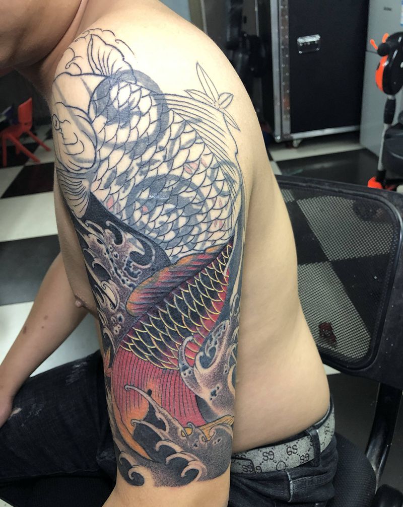 遮盖 鲤鱼纹身图片_手臂新传统纹身图案