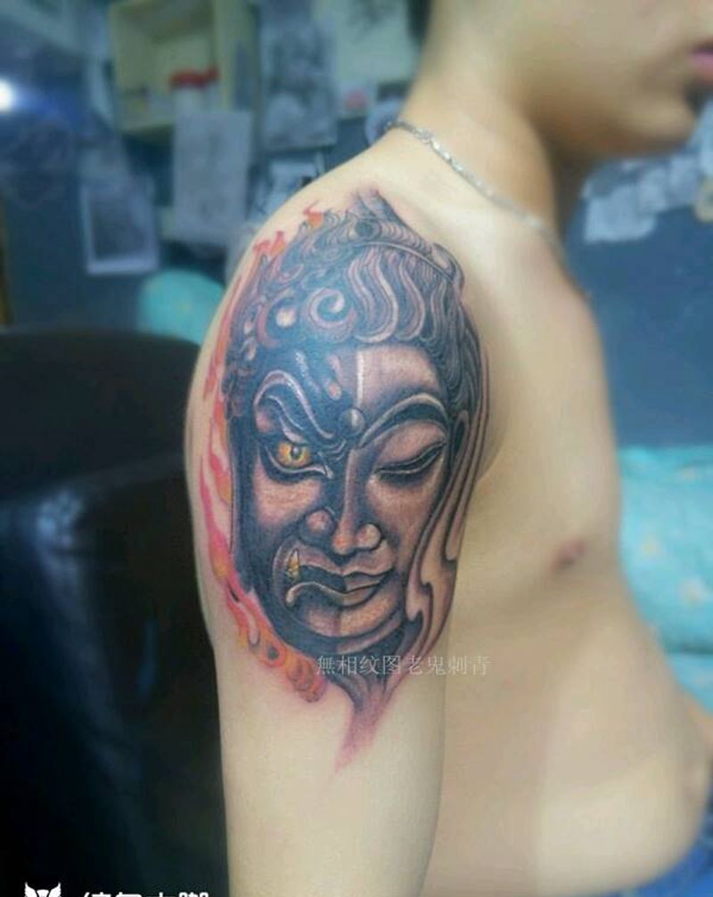 佛魔一念纹身图片_手臂传统宗教成品纹身图案