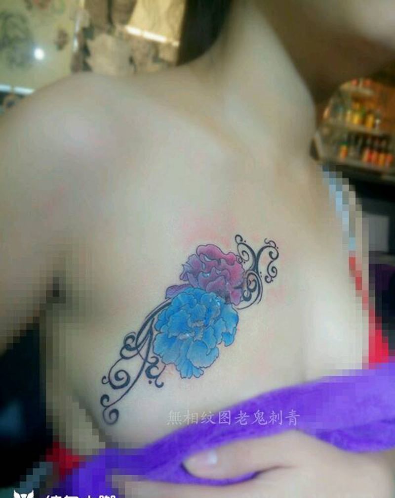 疤痕遮盖纹身图片_胸部花卉成品纹身图案