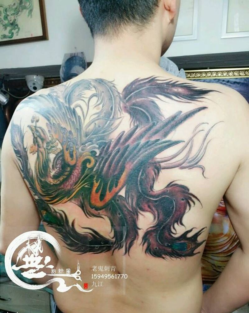 当前位置: 首页 >江西省九江市纹身店-無相纹图老鬼刺青纹身图案>凤纹身图片_背部传统遮盖成品纹身图案
