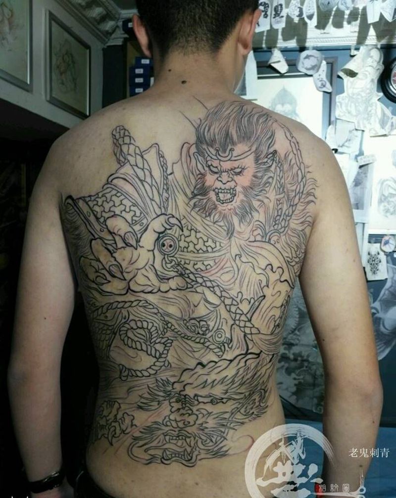 斗战胜佛满背线条纹身图片_背部传统成品纹身图案
