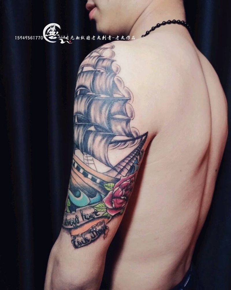 帆船,艺妓纹身图片_肩部手臂欧美传统成品纹身图案