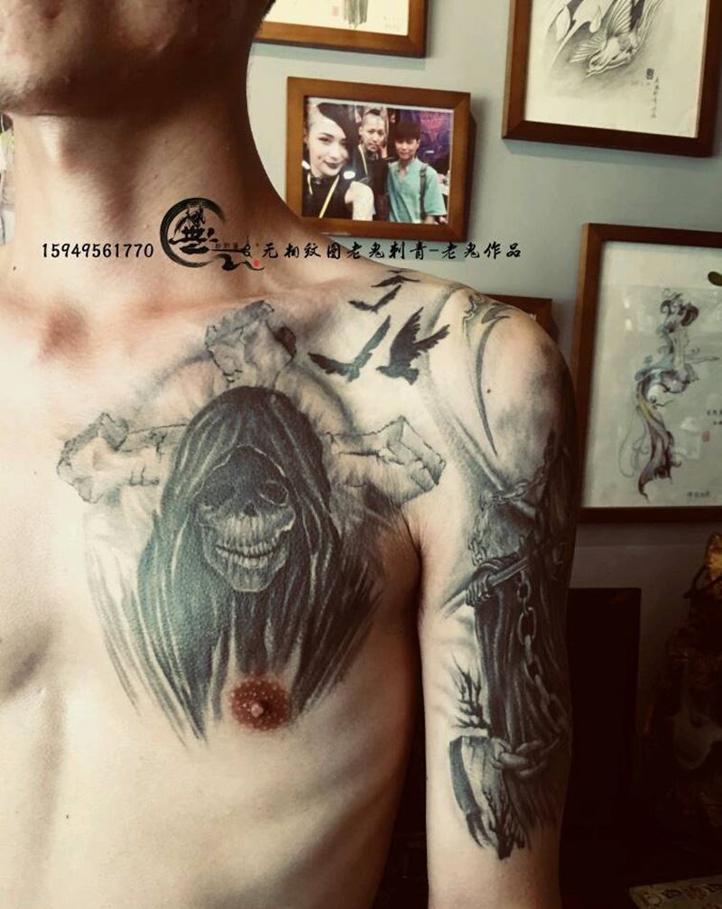 当前位置: 首页 >江西省九江市纹身店-無相纹图老鬼刺青纹身图案>死神纹身图片_手臂胸部欧美半甲纹身图案