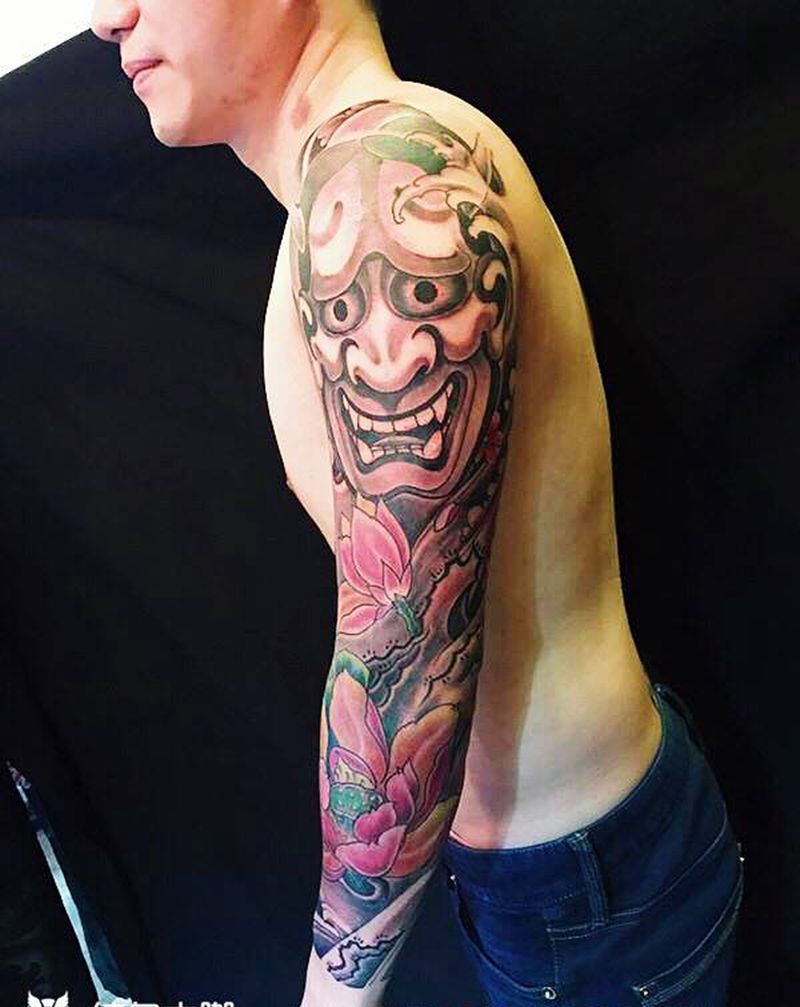 花臂纹身图片_原创彩色鬼神植物传统纹身图案