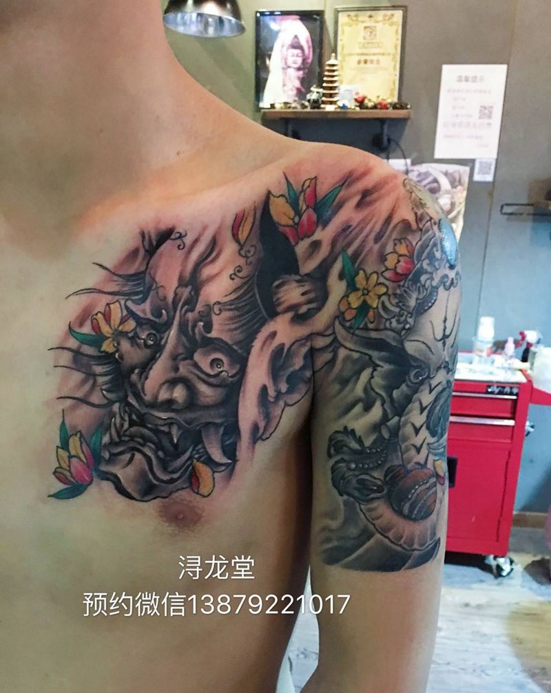 当前位置: 首页 >江西省九江市纹身店-浔龙堂纹身店纹身图案>半甲般若象神纹身图片_手臂肩部胸部传统动物植物鬼神彩色原创纹身图案