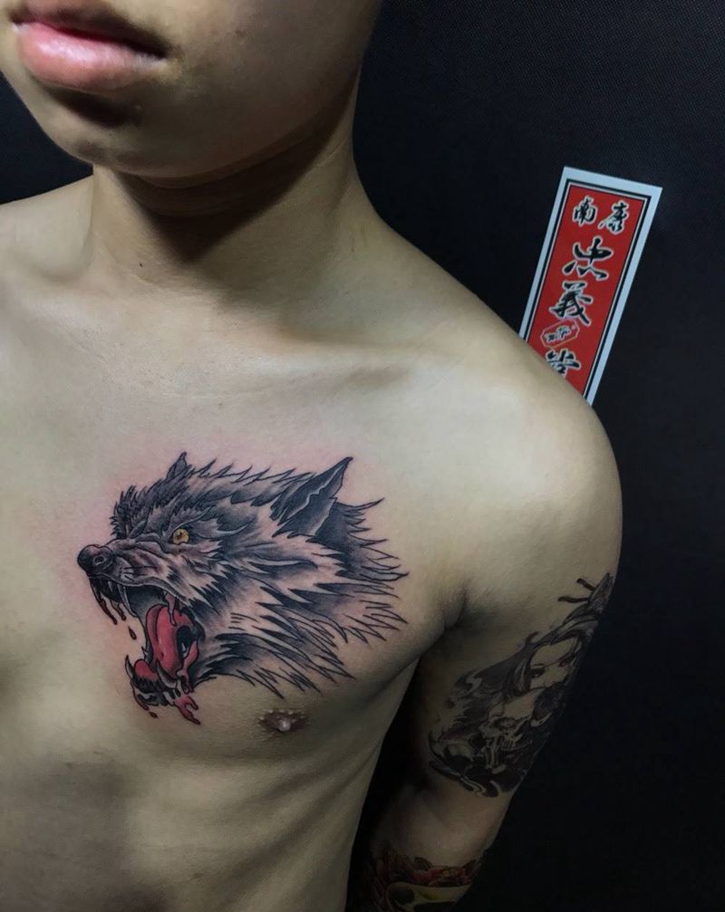 当前位置: 首页 >江西省赣州市纹身店-南康忠义堂纹身机构纹身图案>狼头纹身图片_成品胸部传统动物纹身图案