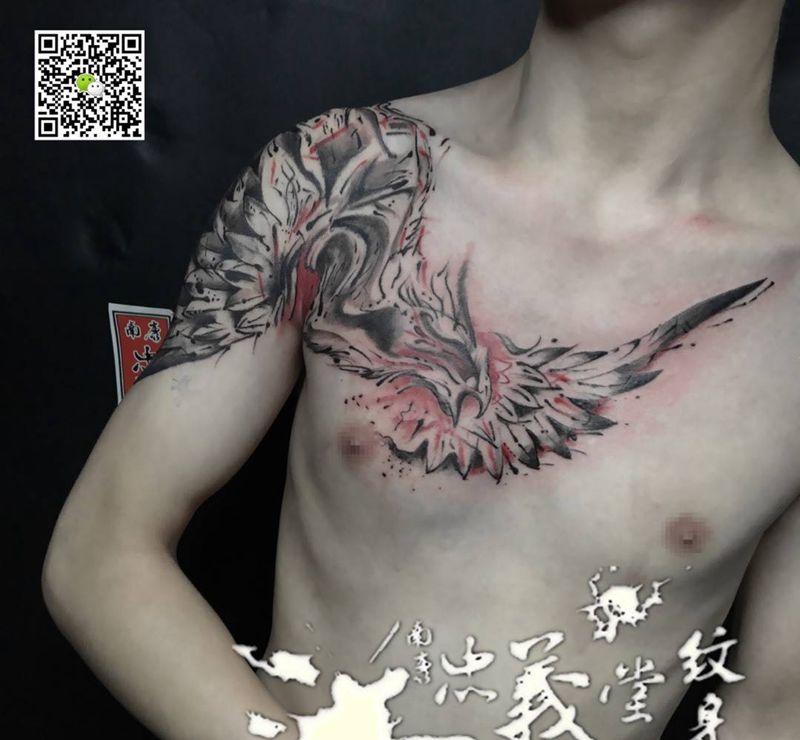 水墨凤凰纹身图片_成品肩部传统写实清新国画肖像欧美几何鬼神纹身图案