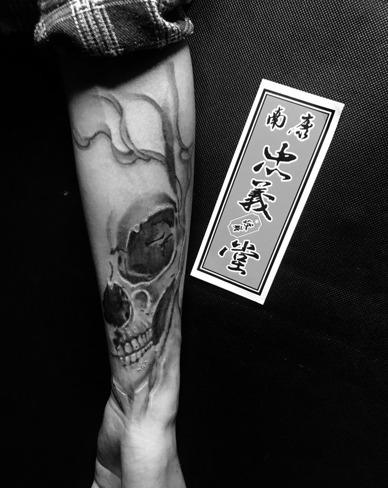 当前位置: 首页 >江西省赣州市纹身店-南康忠义堂纹身机构纹身图案>半面骷髅纹身图片_成品手臂欧美鬼神原创纹身图案