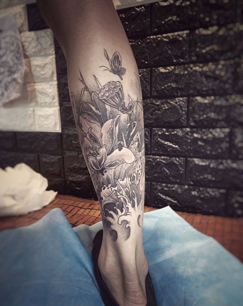 小腿荷花鲤鱼纹身图片_腿部新传统纹身图案