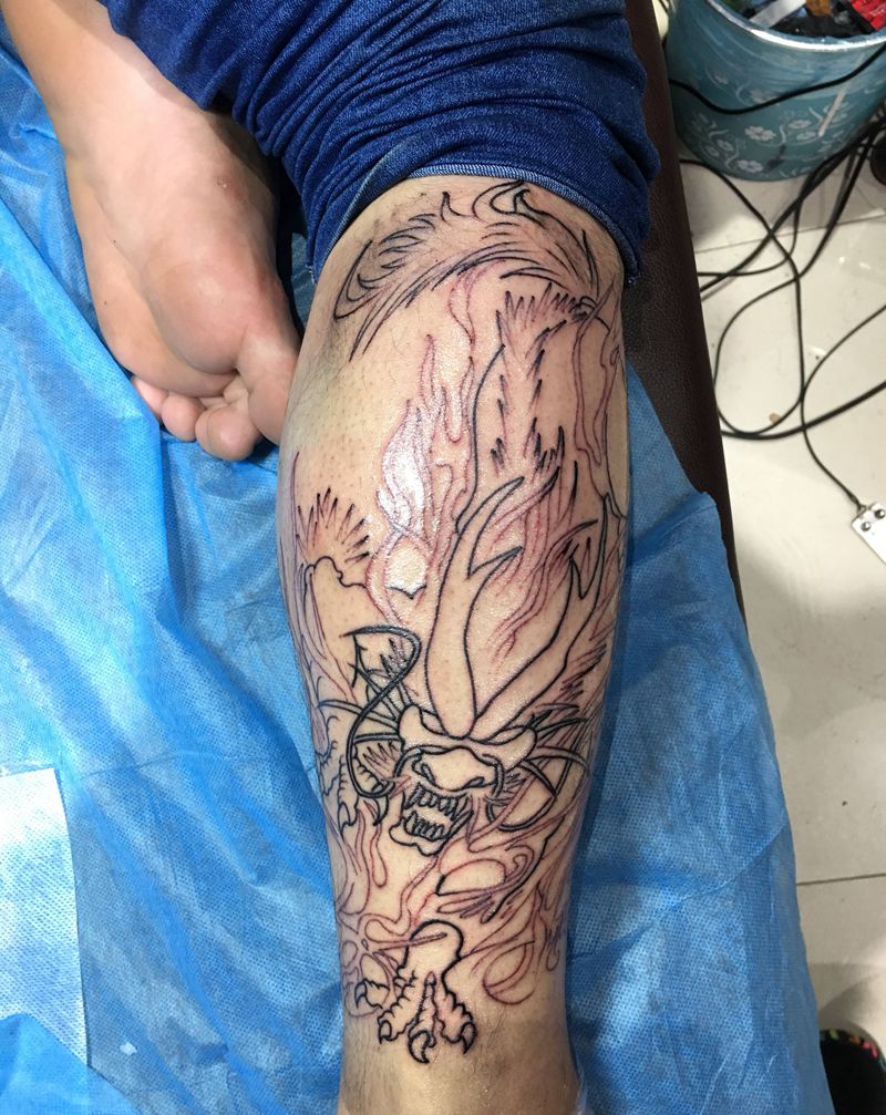 • T网红王老大花腿龙纹身图片_腿部新传统纹身图案