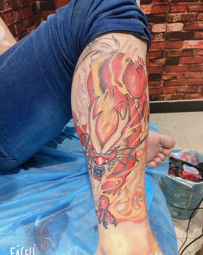 • T网红王老大花腿龙纹身图片_腿部新传统纹身图案