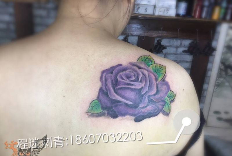 当前位置: 首页 >江西省上饶市纹身店-程迷刺青纹身图案>后肩紫色玫瑰纹身图片_成品肩部背部欧美传统植物原创纹身图案