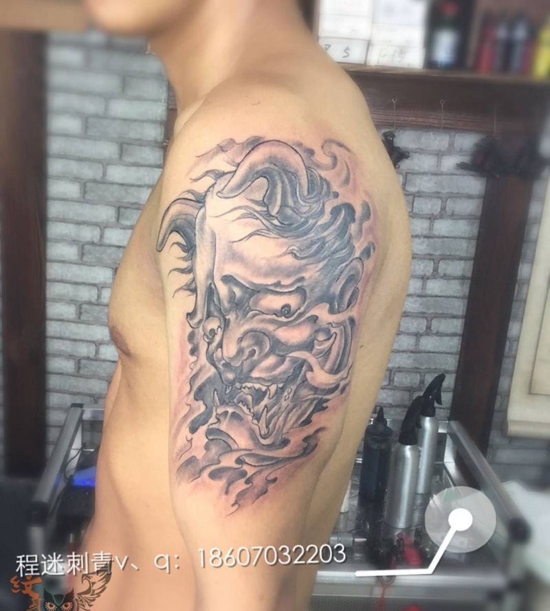 当前位置: 首页 >江西省上饶市纹身店-程迷刺青纹身图案>般诺纹身图片_成品原创鬼神人物传统手臂手部宗教纹身图案