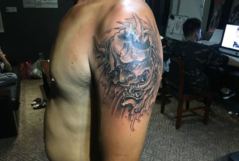 当前位置: 首页 >江西省上饶市纹身店-程迷刺青纹身图案>大臂般若遮盖疤痕纹身图片