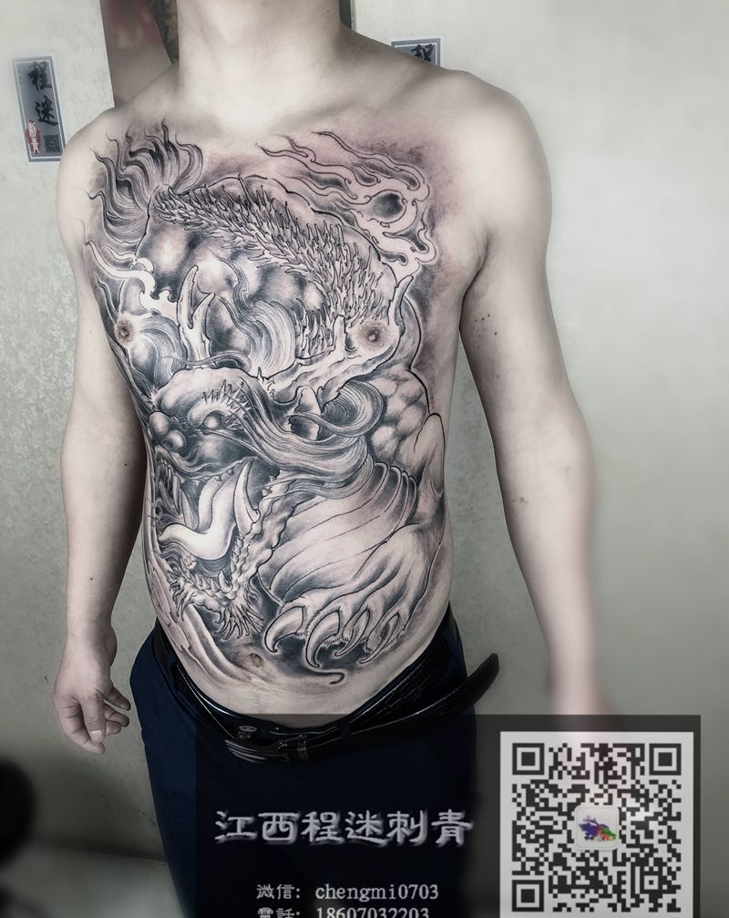 貔貅纹身图片_腹部胸部新传统欧美写实貔貅麒麟纹身图案