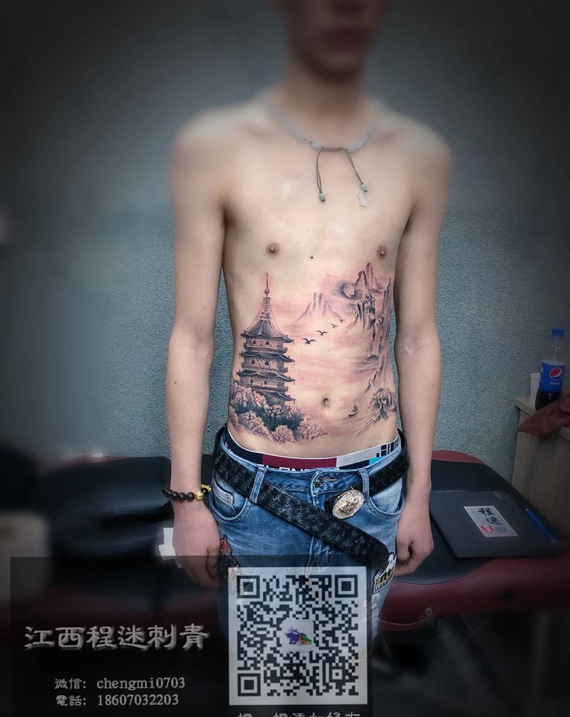 当前位置: 首页 >江西省上饶市纹身店-程迷刺青纹身图案>雷峰塔纹身图片_腹部胸部新传统水墨雷峰塔山水纹身图案