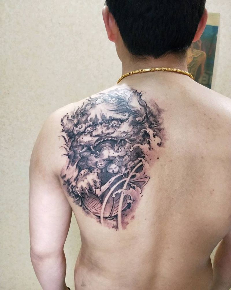 当前位置: 首页 >江西省上饶市纹身店-程迷刺青纹身图案>唐狮纹身图片_肩部传统写实动物成品手稿纹身图案