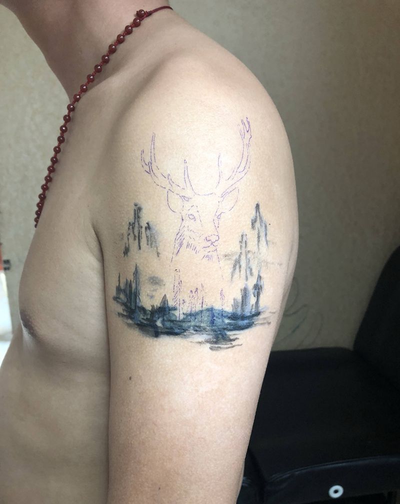 当前位置: 首页 >江西省上饶市纹身店-程迷刺青纹身图案>麋鹿纹身图片_手臂手部新传统水墨鹿麋鹿山水纹身图案