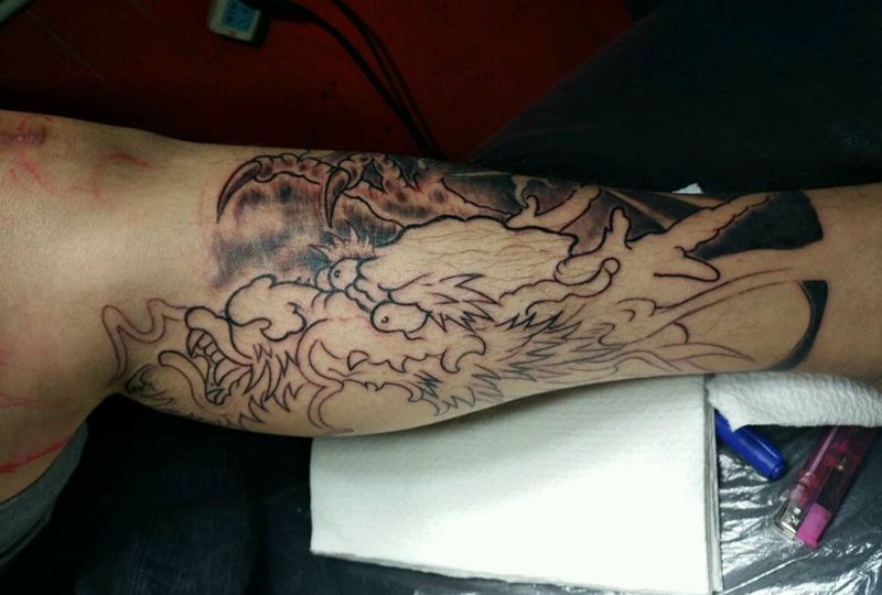 • T网红王老大花腿龙纹身图片_腿部新传统纹身图案