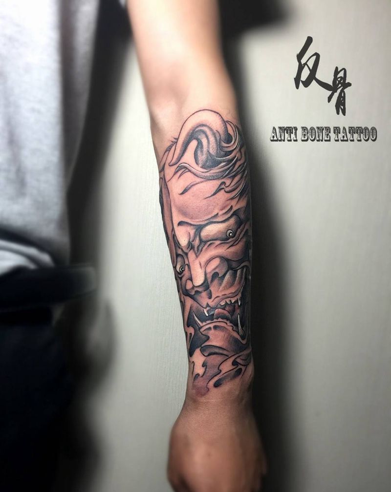 当前位置: 首页 >山东省济南市纹身店-反骨刺青纹身工作室纹身图案>遮盖小疤痕的大脸般若纹身图片_手臂成品传统手部人物鬼神动物静物般若黑白纹身图案