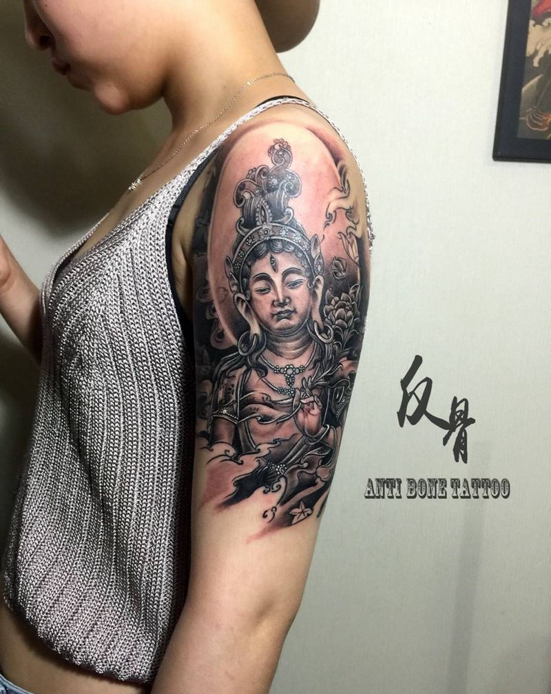 当前位置: 首页 >山东省济南市纹身店-反骨刺青纹身工作室纹身图案>大臂准提菩萨纹身图片_手臂手部传统鬼神人物黑白纹身图案