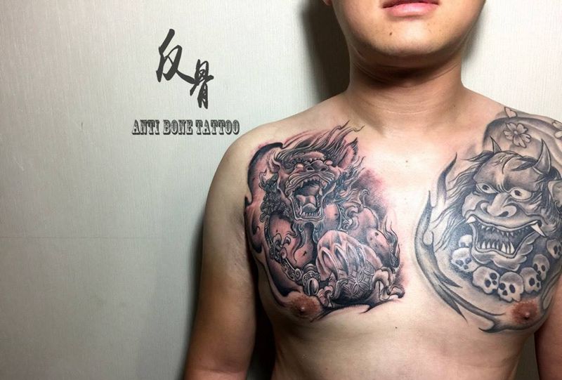 当前位置: 首页 >山东省济南市纹身店-反骨刺青纹身工作室纹身图案>前胸石狮作品(右,非本店作品)纹身图片