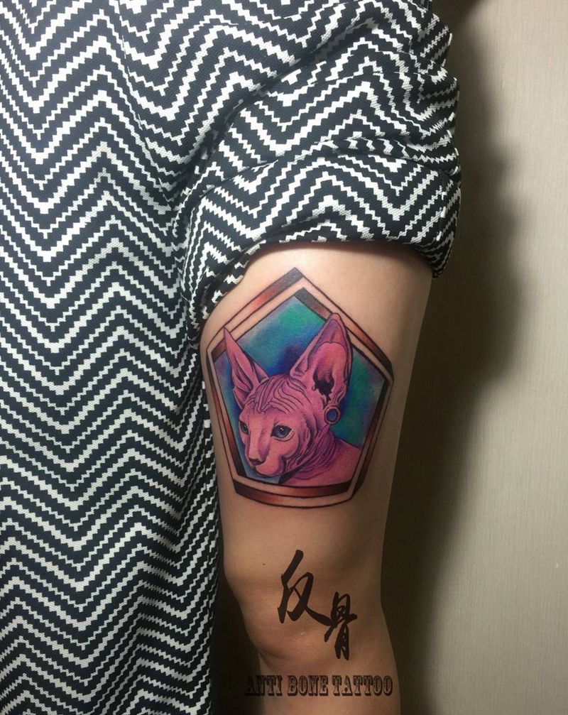 斯芬克斯无毛猫作品纹身图片_成品肩部背部手臂腿部欧美清新动物原创彩图纹身图案