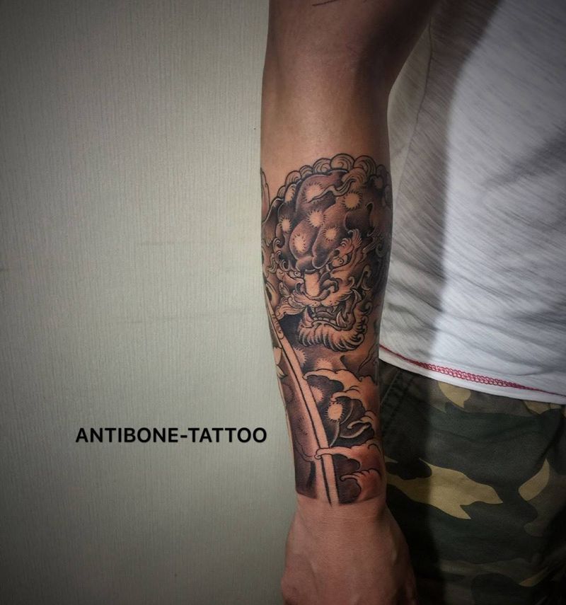 小臂唐狮作品纹身图片_成品手臂腿部传统鬼神动物反骨刺青黑白纹身图案