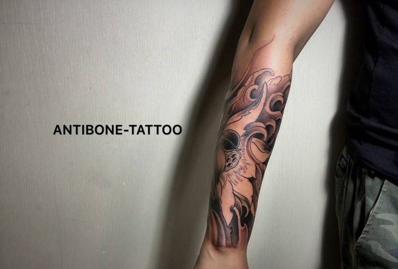 小臂莲花作品纹身图片_成品手臂传统植物反骨刺青黑白纹身图案