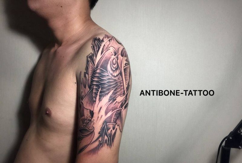 当前位置: 首页 >山东省济南市纹身店-反骨刺青纹身工作室纹身图案>大臂鲤鱼纹身图片_成品臀部手臂腿部传统动物反骨刺青纹身图案