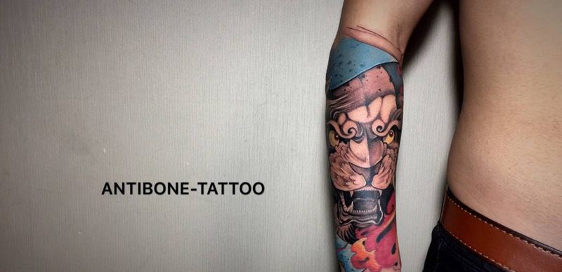 当前位置: 首页 >山东省济南市纹身店-反骨刺青纹身工作室纹身图案># 唐狮# 包小臂,未完成纹身图片_成品手臂传统鬼神彩图反骨刺青纹身图案
