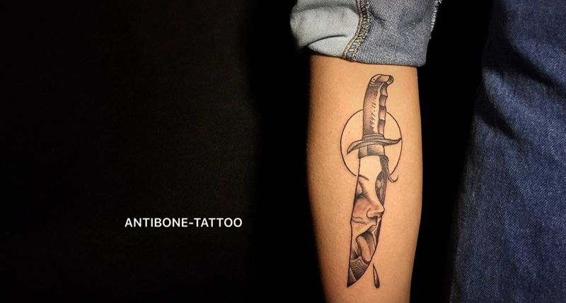 当前位置: 首页 >山东省济南市纹身店-反骨刺青纹身工作室纹身图案># 匕首#纹身图片_成品腿部欧美人物静物黑白反骨刺青纹身图案