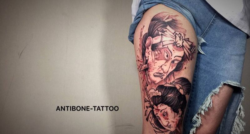 当前位置: 首页 >山东省济南市纹身店-反骨刺青纹身工作室纹身图案># 生首#纹身图片_成品腿部传统习俗鬼神宗教黑白反骨刺青纹身图案
