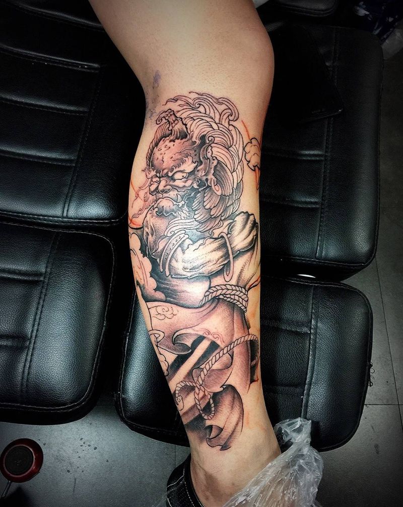 当前位置: 首页 >山东省济南市纹身店-反骨刺青纹身工作室纹身图案># 小腿风神# 未完成。纹身图片_成品腿部手臂传统鬼神黑白反骨刺青纹身图案