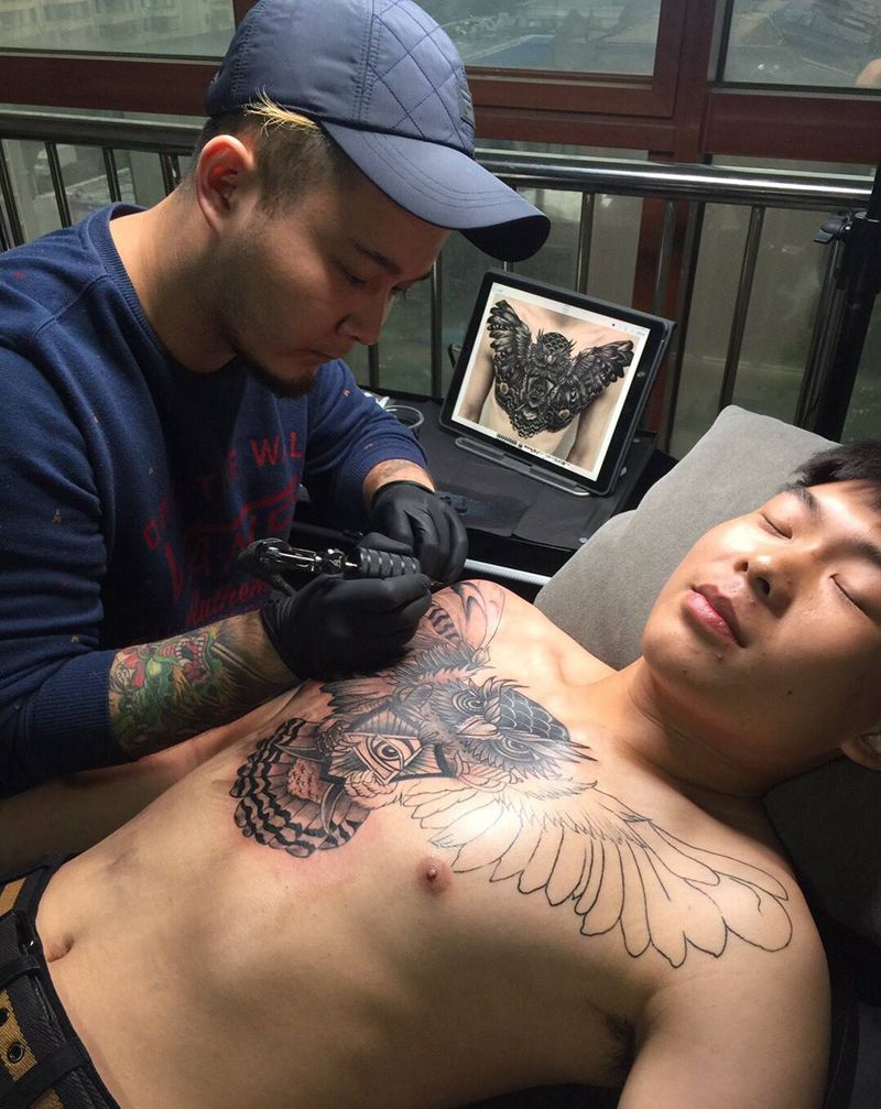 当前位置: 首页 >山东省济南市纹身店-反骨刺青纹身工作室纹身图案># 猫头鹰#纹身图片_成品胸部欧美动物几何图腾反骨刺青猫头鹰培训纹身图案