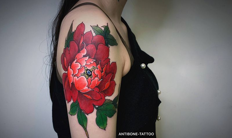 当前位置: 首页 >山东省济南市纹身店-反骨刺青纹身工作室纹身图案>#牡丹#彩色纹身图片_手臂腿部老传统新传统牡丹花红花纹身图案
