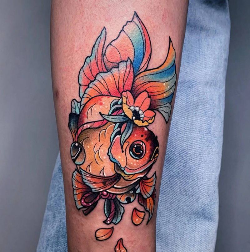 #金鱼#纹身图片_腿部新传统New School金鱼纹身图案