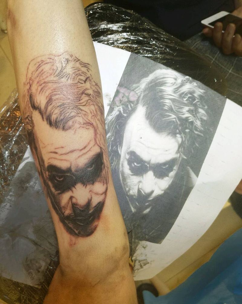 当前位置: 首页 >江西省上饶市纹身店-兮阳刺青纹身图案>希斯莱杰 小丑纹身图片_欧美肖像写实人物原创成品纹身图案