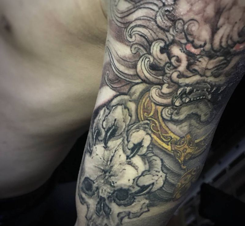 当前位置: 首页 >江西省上饶市纹身店-兮阳刺青纹身图案>唐狮纹身图片_成品手部手臂腿部背部传统动物新传统纹身图案